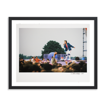 This limited edition fine art giclée print features Mick Jagger mid-performance, photographed by acclaimed British photographer Denis O’Regan during a Rolling Stones concert at Hippodrome d'Auteuil, Paris in 1982. Captured in vivid colour, Jagger is seen wearing white leggings, a pink top and vest, and an open-collared shirt featuring a bold, script-style print as he performs on a vividly styled stage.
