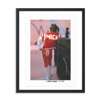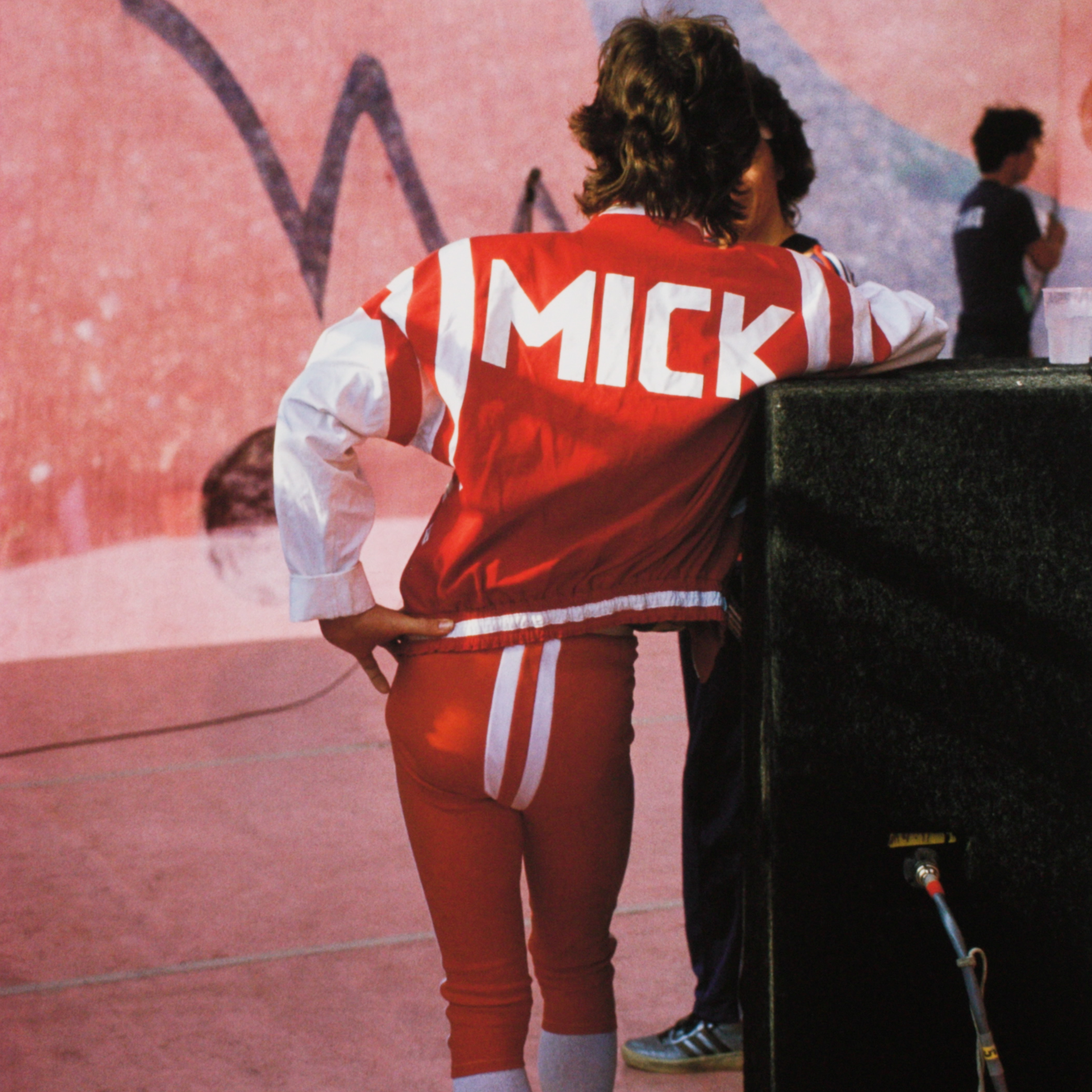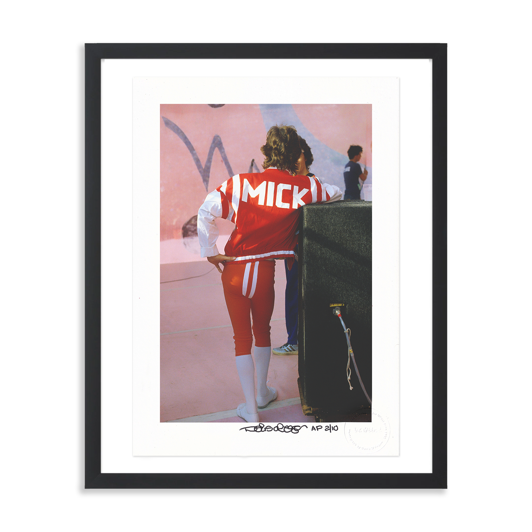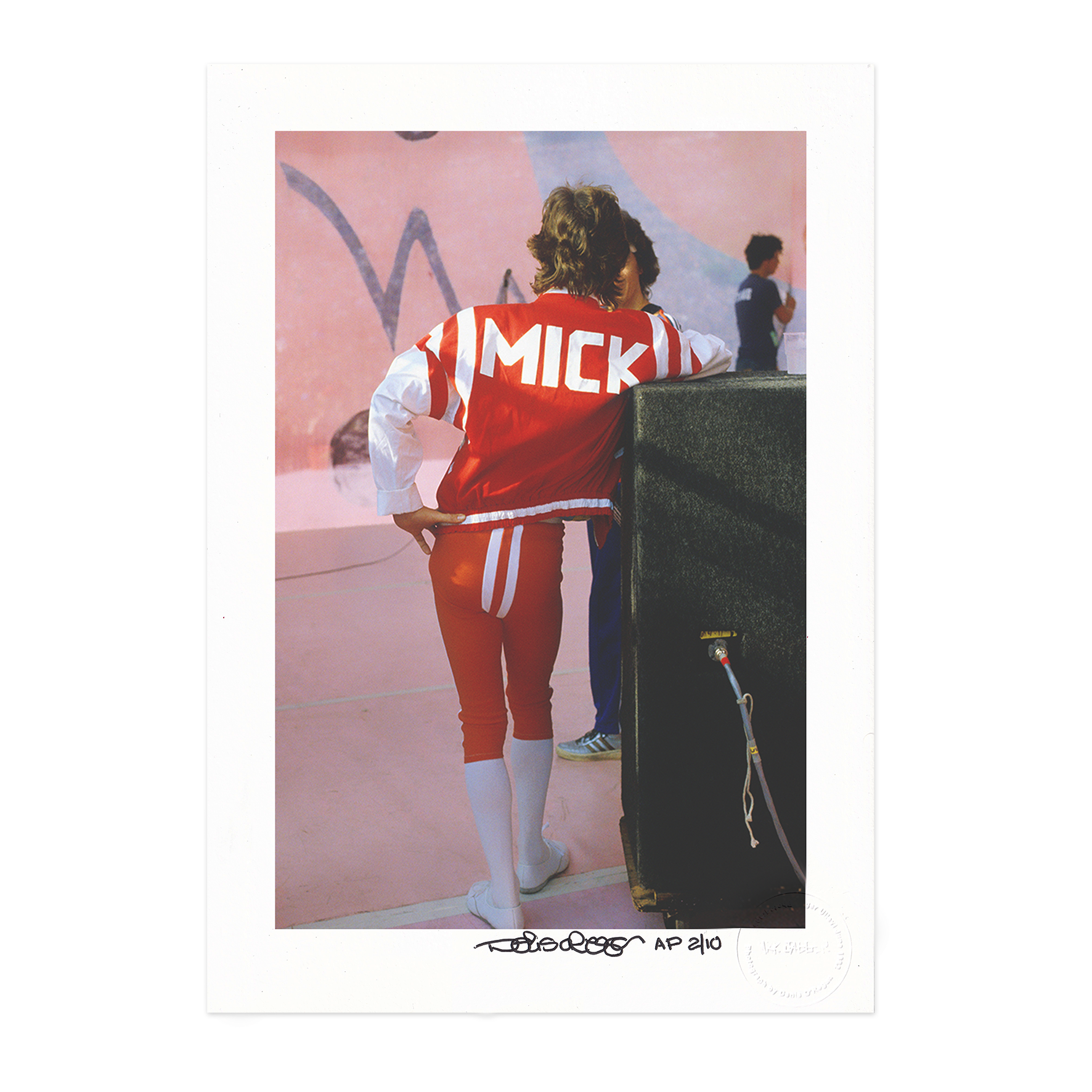 This limited edition fine art giclée print features Mick Jagger photographed by renowned British photographer Denis O’Regan at Slane Castle, Ireland, just before going on stage. Pictured wearing red-and-white striped trousers and a matching jacket with “MICK” spelled out in bold white lettering.