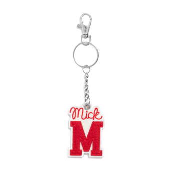 A reversible felt appliqué embroidered keychain with metal hardware clasp, link and chain.